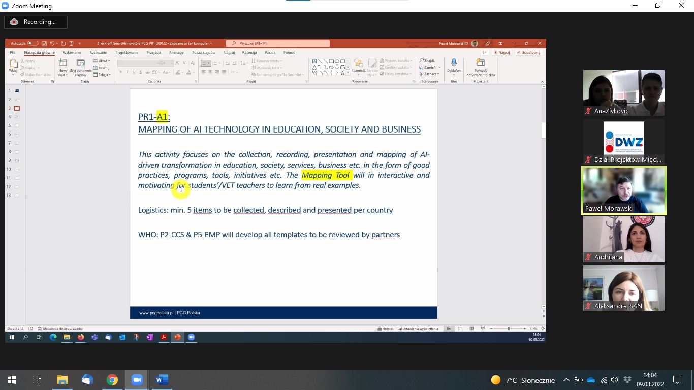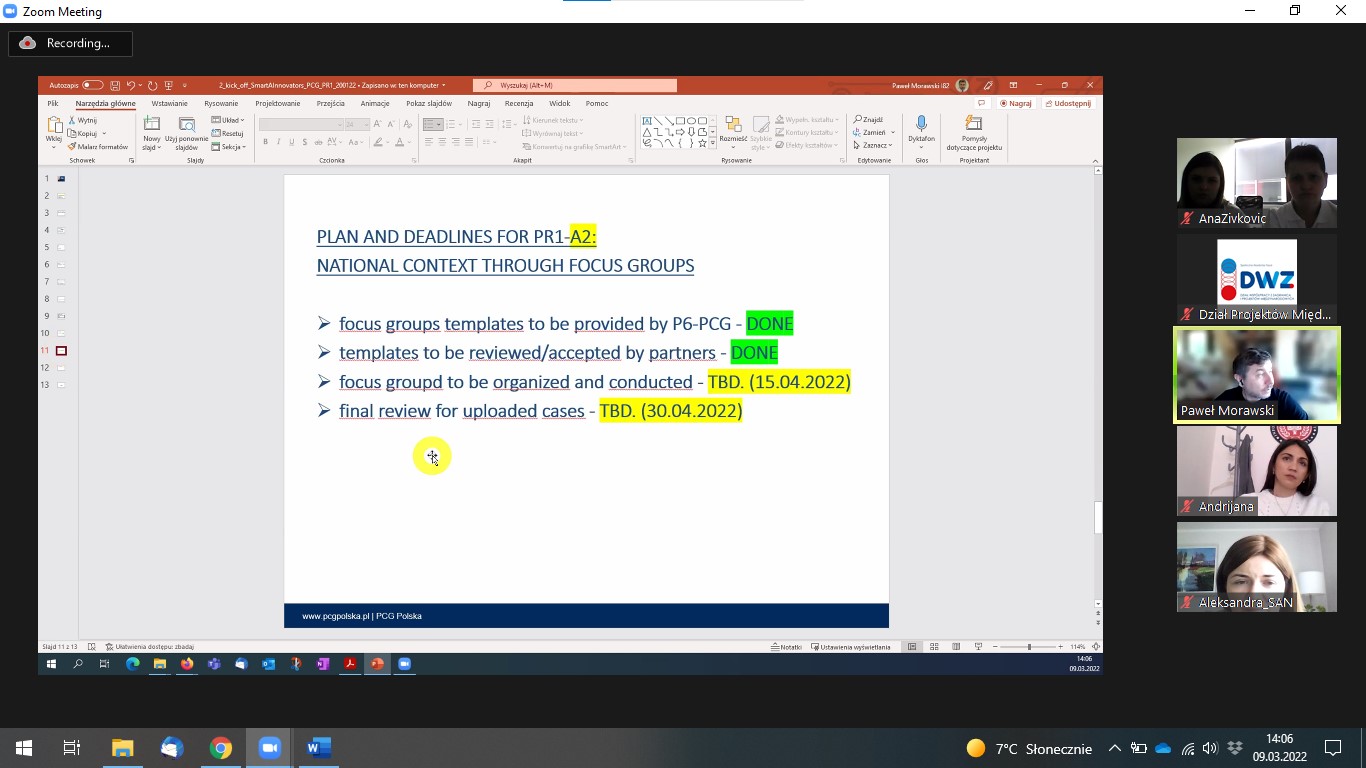 Na dzisiejszym spotkaniu omówiliśmy kroki potrzebne do realizacji zadań z rezultatu 1, tj. wzory dokumentów dla grup fokusowych oraz prezentacji wizualnych. Przedyskutowaliśmy także kwestie związane ze spotkaniem partnerskim, które odbędzie się w czerwcu w Grecji.